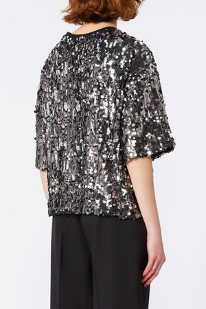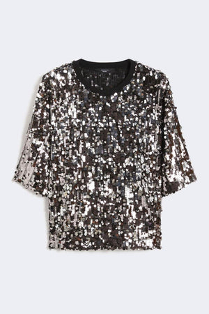 Blusa Max Mara Weekend Cacao1234 in tulle ricamato con paillettes di varie dimensioni per un effetto luminoso e dinamico. La linea boxy e il girocollo in jersey a costine assicurano un fit moderno e confortevole, mentre le maniche corte a giro basso aggiungono un tocco di originalità. Foderata per garantire comfort, questa blusa è perfetta per valorizzare i look delle festività con un’eleganza contemporanea.