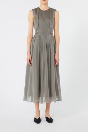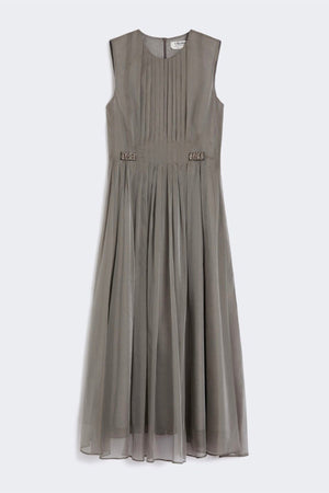 Questo abito midi smanicato in organza di mista seta presenta una vestibilità fit and flare che valorizza la silhouette. Il motivo di pieghe dona volume alla gonna, mentre lo scollo a giro e il plastron frontale aggiungono raffinatezza. La chiusura con zip invisibile sul retro assicura una linea pulita, completata da tasche nei fianchi per praticità. Il capo, foderato internamente, presenta inoltre applicazioni gioiello rimovibili in vita, per un tocco di eleganza personalizzabile. Una scelta impeccabile per occasioni formali.