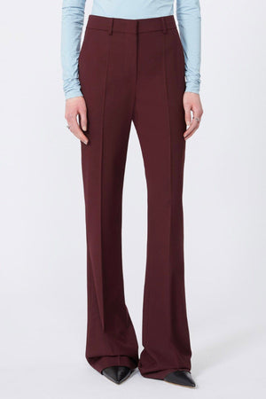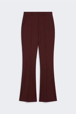 Questi pantaloni aderenti Sportmax color vino uniscono eleganza maschile e femminilità in un capo sofisticato. Realizzati in saglia di lana stretch, offrono comfort e vestibilità regolare con vita bassa e linea flare al fondo. Caratterizzati da chiusura con gancio a uomo, cintura interna personalizzata, tasche laterali alla francese e posteriori a filetto, presentano pieghe stirate sia sul fronte che sul retro, per un aspetto impeccabile e sartoriale. Ideali per chi cerca stile e precisione nel dettaglio.
