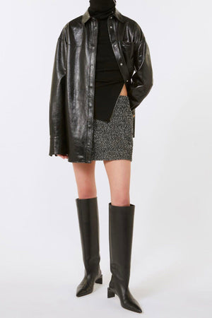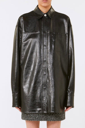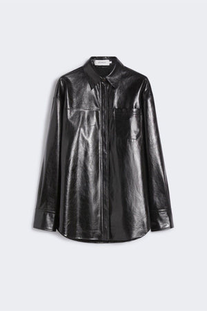 La camicia in pelle lucida Sportmax Borel si distingue per un fit oversize dal mood urbano, ideale da indossare come capo esterno su top minimalisti o abbinata a mini skirt a contrasto. Il collo a camicia e l’abbottonatura nascosta con primo bottone a vista assicurano un look pulito, mentre il taschino applicato al petto aggiunge un dettaglio funzionale. Il fondo stondato con spacco profondo enfatizza il design ampio e contemporaneo, conferendo movimento e originalità.