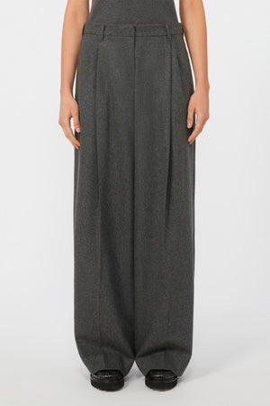 Pantaloni wide leg in flanella di lana stretch, caratterizzati da una silhouette con gamba larga e doppia pinces sul davanti che valorizzano la linea. La chiusura alta in vita con listino, zip con patta e gancetto garantisce una vestibilità precisa. Dotati di tasche alla francese sui fianchi e tasche a filetto con bottone in corno sul retro, offrono funzionalità e dettagli raffinati. I passanti per cintura completano il design, permettendo di personalizzare lo stile con accessori.