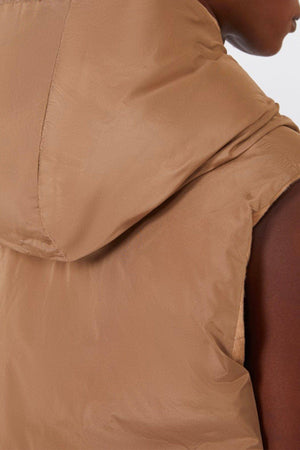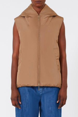 Il gilet reversibile Max Mara The Cube Delfy combina eleganza e funzionalità. Realizzato in drap di puro cammello zibellinato con trapuntatura a righe, offre calore grazie all’imbottitura in piuma d’oca. L’interno in taffetà liscio antigoccia assicura comfort e praticità, mentre il cappuccio presenta il logo Max Mara ricamato sul lato interno, aggiungendo un tocco distintivo. Il modello a vestibilità regolare è completato da una chiusura frontale con zip e tasche a filettone su entrambi i lati. Confezionato nella custodia Cube Bag, è perfetto per i viaggi.