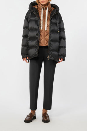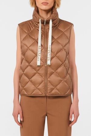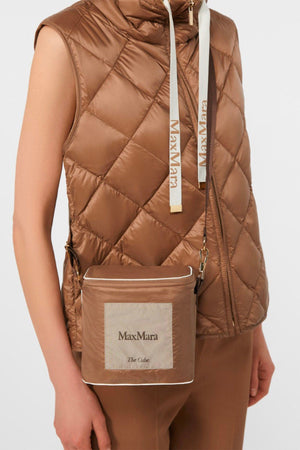 Il gilet imbottito donna Max Mara The Cube Tregic unisce stile e protezione. Realizzato in nylon cangiante antigoccia con trapuntatura a rombi, garantisce resistenza e comfort. Il collo alto con coulisse presenta maxi nastri jacquard logati, conferendo un dettaglio distintivo e regolabile. La linea regular si adatta facilmente a ogni silhouette, mentre la chiusura frontale con zip e le tasche inserite nei fianchi offrono praticità. L’imbottitura in piuma d’oca assicura calore ottimale. Perfetto per il viaggio, è consegnato nella custodia Cube Bag.