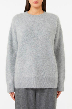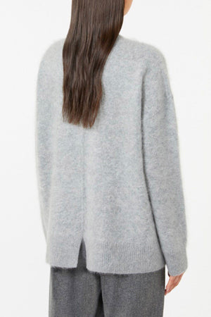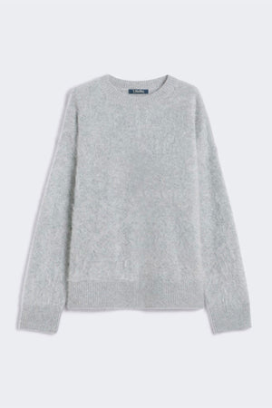 Maglia in puro cachemire garzato con texture soffice e piacevole al tatto. Presenta una linea morbida e maniche lunghe a giro basso che garantiscono comodità e libertà di movimento. Il girocollo classico e i bordi a costine aggiungono un tocco elegante, mentre il fondo leggermente asimmetrico con piccolo spacco sul retro definisce una silhouette moderna. Le cuciture su fianchi e retro completano il design con dettagli raffinati e curate finiture.