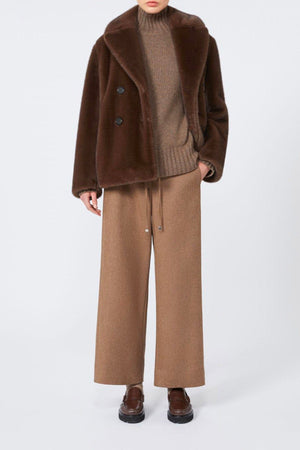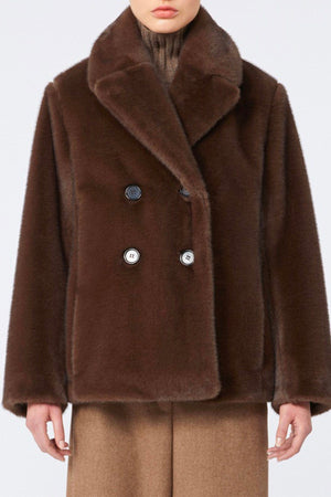 Questa giacca doppiopetto presenta una silhouette avvolgente con un taglio leggermente cropped, ideale per un look contemporaneo. Realizzata in tessuto dalla texture soffice, è dotata di collo a rever e maniche lunghe a giro che ne esaltano la vestibilità. La chiusura frontale a vista con bottoni in corno aggiunge un dettaglio raffinato, mentre le tasche inserite nei fianchi garantiscono praticità. Foderata internamente, offre comfort e calore senza rinunciare allo stile.