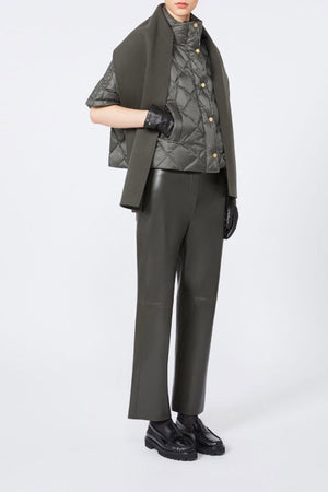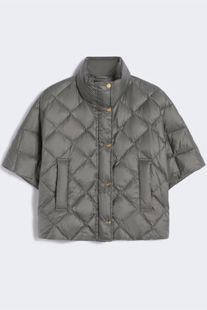 La cappa imbottita Max Mara The Cube Tresi unisce estetica moderna e funzionalità. Realizzata in nylon cangiante antigoccia con trapuntatura a rombi, assicura protezione e stile distintivo. Il collo alto garantisce calore, mentre gli spacchi laterali, chiudibili con bottoni a pressione logati, trasformano la cappa creando un effetto manica elegante. Le maniche corte e le tasche a filettone offrono praticità, mentre la chiusura nascosta con zip e bottoni a pressione mantiene un design pulito. L’imbottitura in piuma d’oca assicura comfort termico leggero e raffinato.