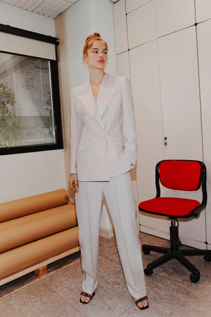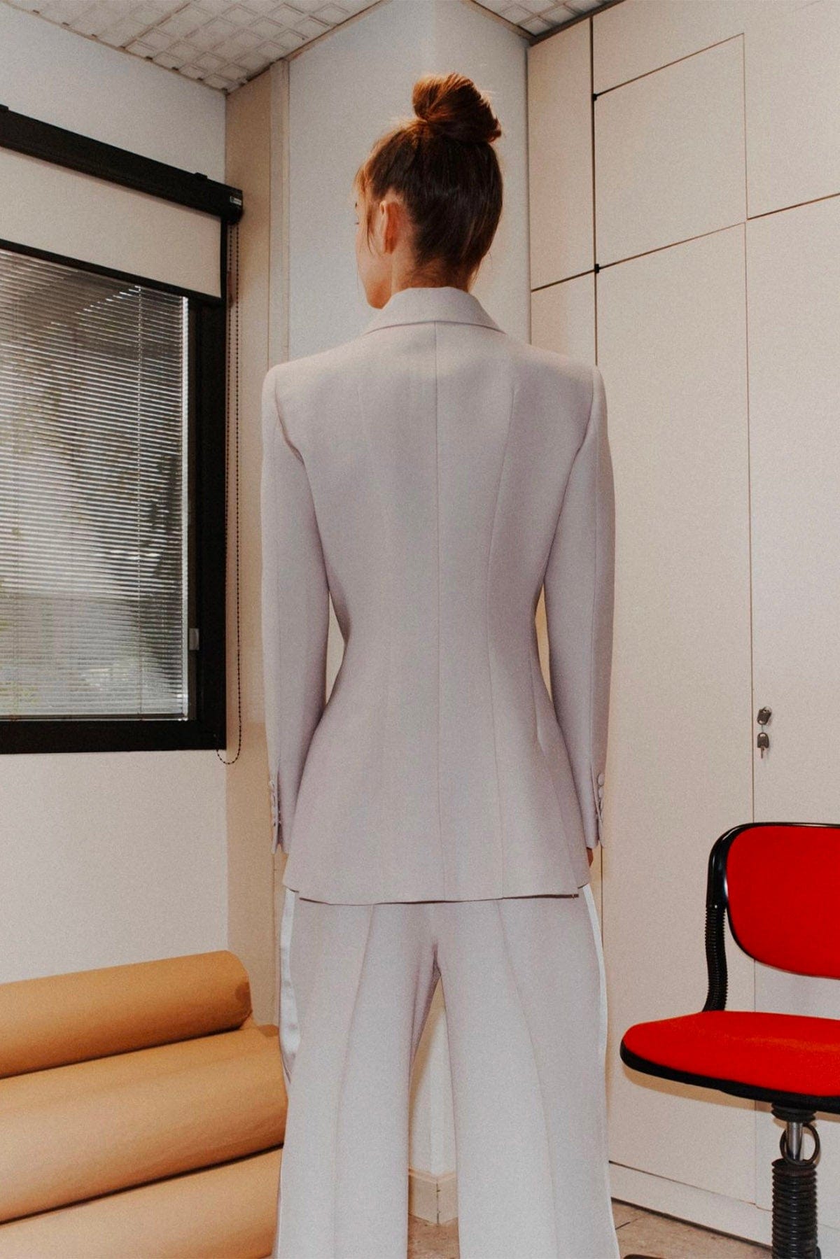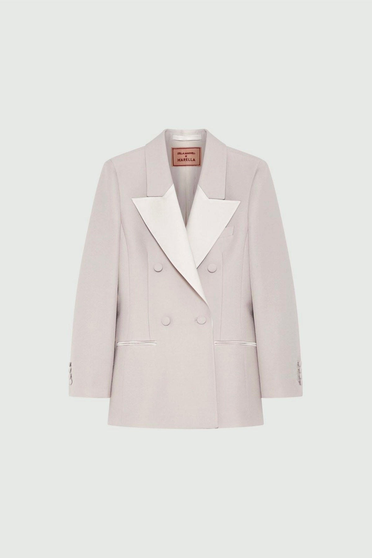 Questa giacca avorio firmata Marella in collaborazione con Stella Maxwell unisce un taglio sartoriale deciso a una silhouette femminile e molto aderente. Realizzata in sablé di lana e viscosa, presenta uno scollo con rever a lancia e raffinati dettagli in raso lucido tono su tono sui taschini a filetto. La fodera interna in tessuto jacquard personalizzato completa un capo che esprime eleganza metropolitana con grande cura per i materiali e la vestibilità.