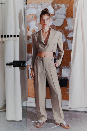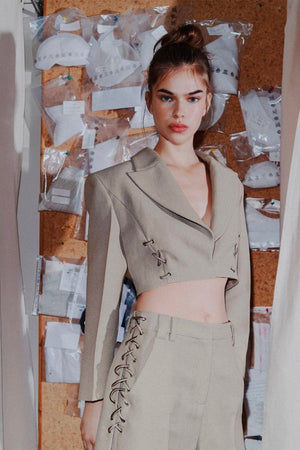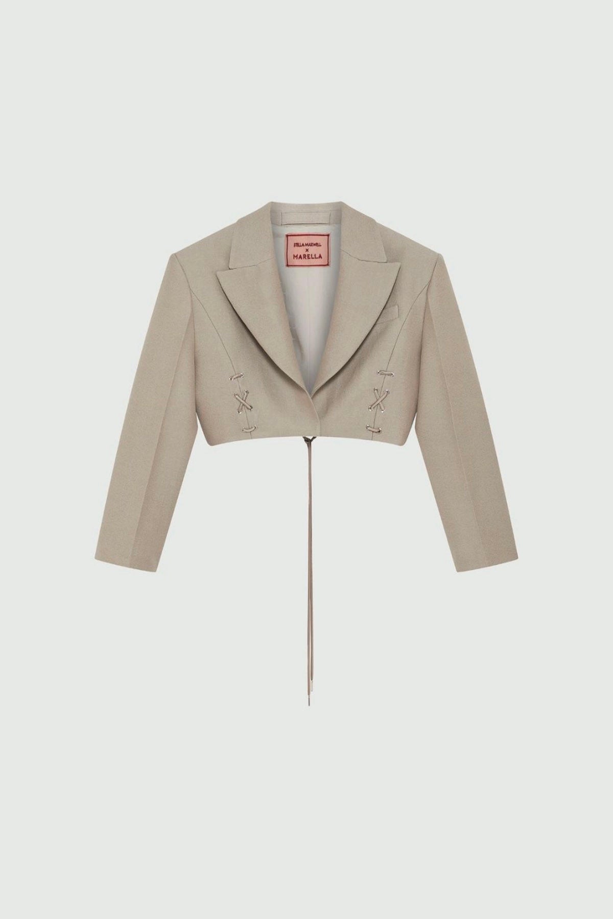Questa giacca corta femminile unisce eleganza sartoriale e dettagli distintivi, con lacci ispirati alla corsetteria che valorizzano i fianchi e il retro. Realizzata in sablé di lana e viscosa, offre un fit cropped raffinato, mentre lo scollo a rever e le maniche con piega stirata completano il design. Perfetta da abbinare ai pantaloni coordinati, appartiene alla collezione Marella Codesign in collaborazione con Stella Maxwell. La fodera interna personalizzata in tessuto jacquard aggiunge un tocco di esclusività.