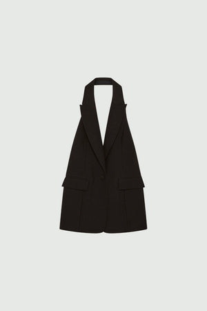 Questo top blazer in sablé di lana e viscosa unisce l’eleganza di un blazer a una silhouette sensuale e femminile. La linea aderente, il collo con rever e il taglio smanicato definiscono un design raffinato, mentre la schiena completamente scoperta con cintura regolabile a bottoni aggiunge un dettaglio distintivo. Completano il modello le tasche laterali con patta, per un equilibrio perfetto tra stile e funzionalità. Parte della collezione Marella Codesign in collaborazione con Stella Maxwell, è ideale per occasioni speciali.