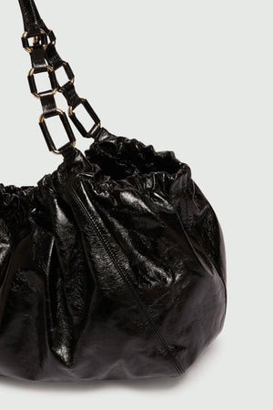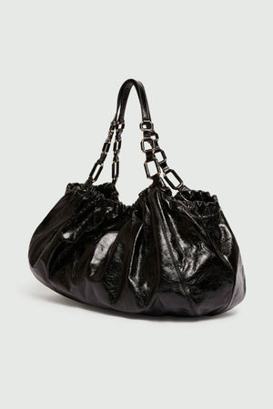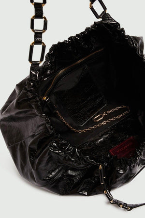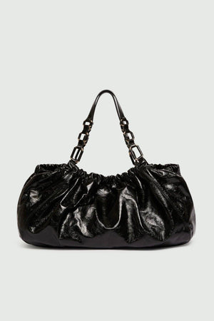 Questa shopper grande in pelle lucida effetto craquelé con finiture dorate unisce capienza e stile sofisticato. Il motivo arricciato sul bordo valorizza il design, mentre il manico corto con anelle oro chiaro e la tracolla lunga imbottita e rimovibile offrono versatilità. Internamente, la fodera jacquard personalizzata include tasca con zip, tasca arricciata porta cellulare in pelle e moschettone con catena per chiavi. Parte della collezione Marella Codesign in collaborazione con Stella Maxwell, è perfetta per affrontare con energia le giornate più intense.
