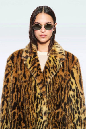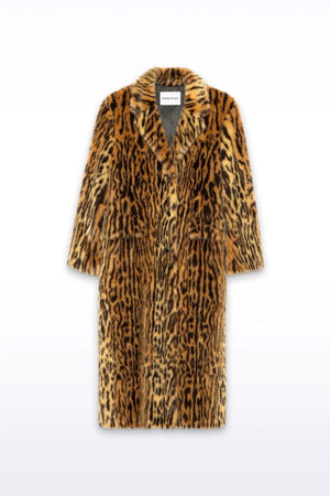 Pelliccia ecologica donna leopardata Marceline, caratterizzata da una silhouette lunga e dritta con spalle decise che donano struttura al capo. Realizzata in morbido eco-fur 100% poliestere, è completa di tasche a patta, bottoni tono su tono frontali e polsini con bottoni per un dettaglio raffinato. Completamente foderata per maggiore comfort, richiede pulizia professionale a secco. Un capo versatile e sofisticato per un look distintivo.