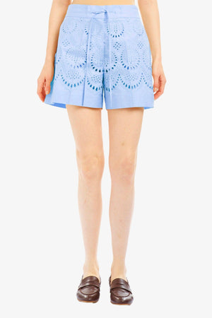 Shorts in puro cotone con delicato pizzo sangallo, un capolavoro di eleganza femminile firmato Parosh. La tonalità azzurra conferisce freschezza e versatilità, perfetta per composizioni sofisticate sia casual che più raffinate. Il pizzo sangallo, lavorato a mano, aggiunge un tocco di ricercatezza senza compromessi sulla comodità. La fibra naturale garantisce traspirazione e morbidezza sulla pelle, ideale per la stagione calda. Un pezzo che racchiude l'essenza dello stile italiano: qualità costruttiva, attenzione ai dettagli e femminilità consapevole.