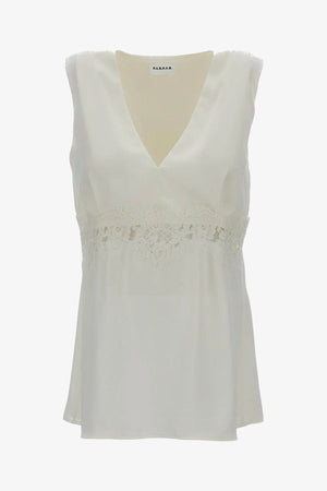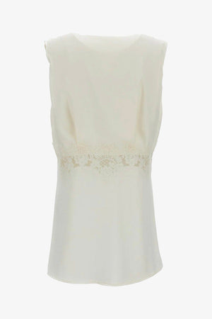 Blusa senza maniche in tonalità panna con elegante scollo a V e raffinato inserto in pizzo. Un capo versatile che unisce semplicità e sofisticazione, perfetto per creare look sia casual che più formali. Realizzato in Italia con cura artigianale, questo top rappresenta un'aggiunta essenziale al guardaroba di chi apprezza la qualità e lo stile senza compromessi.