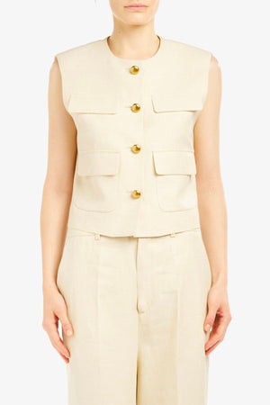 Gilet senza maniche in lino sabbia della collezione Parosh, caratterizzato da un design raffinato e funzionale. Quattro tasche frontali offrono praticità e stile, mentre i bottoni dorati aggiungono un tocco di eleganza sofisticata. Perfetto per creare outfit versatili, dal casual al semi-formale, questo capo si distingue per la qualità del tessuto naturale e i dettagli curati che lo rendono un pezzo essenziale nel guardaroba.