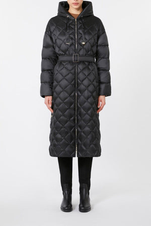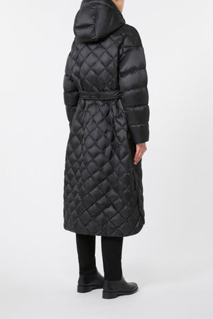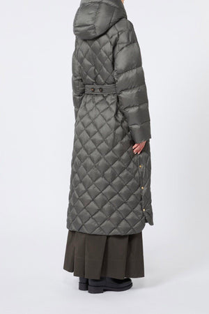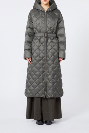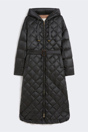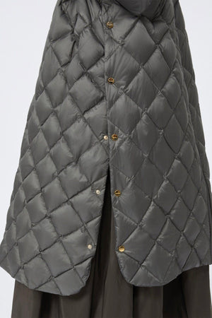 L’imbottito lungo donna Max Mara The Cube Trepar presenta una silhouette dritta con profondi spacchi stondati laterali, apribili tramite bottoni a pressione logati per un tocco di versatilità e stile. Realizzato in nylon antigoccia trapuntato a rombi, combina resistenza e protezione. Il cappuccio a coulisse e le maniche lunghe con trapuntatura a righe orizzontali e spalla scesa assicurano comfort e libertà di movimento. La chiusura frontale con zip a doppio cursore e le tasche a filettone sui fianchi completano il design funzionale. La cintura rimovibile con fibbia, fissata con bottoni in corno sul retro, permette una vestibilità personalizzata, mentre l’imbottitura in piuma d’oca garantisce calore e leggerezza.