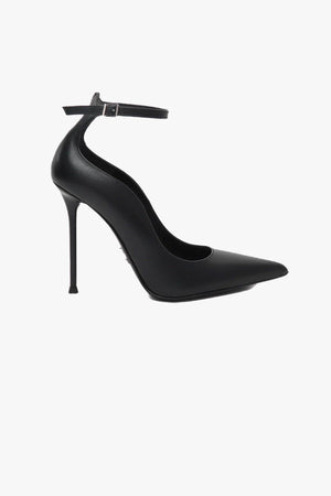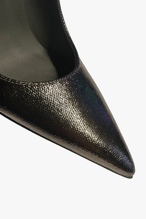 Le décolleté Livia56 di Sergio Levantesi si distinguono per la vernice effetto lucertola color acciaio cangiante, con punta affusolata e cinturino alla caviglia impreziosito da un dettaglio lodo dorato. La fodera e la soletta in pelle offrono comfort, mentre la suola in cuoio e gomma assicura durata e stabilità. Il tacco a stiletto alto 10,5 cm valorizza la silhouette con un tocco di sofisticata eleganza.