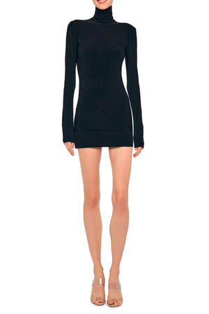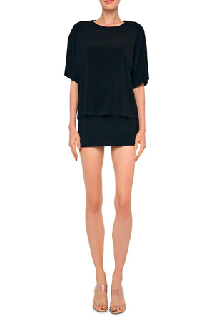 Mini gonna nera con vita alta e cintura elasticizzata, caratterizzata da una silhouette aderente e lineare. L'orlo dritto e la vestibilità slim creano proporzioni eleganti e definite, mentre la cintura elastica assicura comfort e praticità. Questo capo essenziale rappresenta un elemento versatile del guardaroba, perfetto per look audaci e contemporanei che richiedono semplicità costruttiva e impatto visivo immediato.