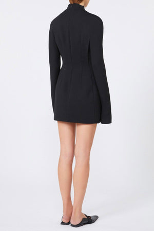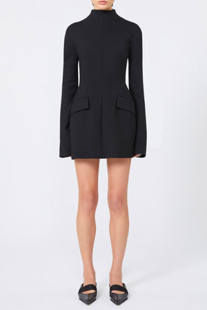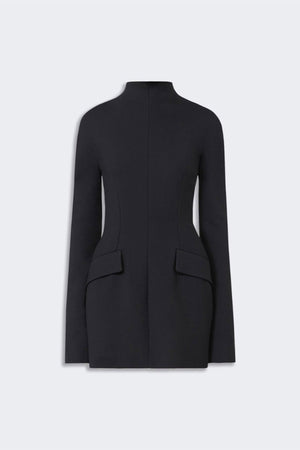 Questo abito corto in gabardina di misto lana stretch presenta una linea grafica che sagoma la silhouette, valorizzando i fianchi con una vestibilità aderente in vita e fianchi arrotondati. Il collo rialzato con zip invisibile posteriore assicura un look elegante e pulito. La costruzione con pince e fianchetti sagomati garantisce una calzata perfetta, mentre le tasche laterali con patta aggiungono dettaglio funzionale senza compromettere l’estetica raffinata del capo. Perfetto per chi cerca stile contemporaneo e comfort.