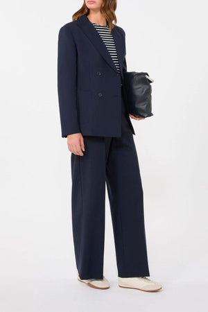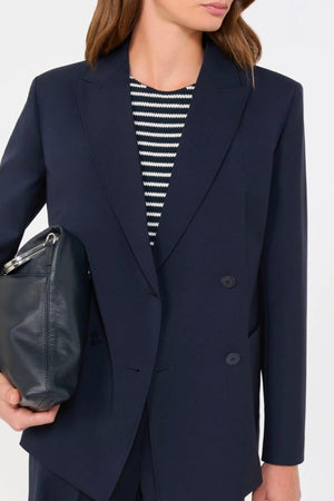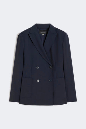 Blazer doppiopetto in tela di pura lana natural stretch che esprime maestria sartoriale. La linea leggermente sfiancata con spacco centrale sul retro assicura eleganza e libertà di movimento. Il collo rever a lancia e le maniche a giro con bottoni sui polsi riflettono dettagli costruttivi raffinati, mentre le tasche applicate sul davanti aggiungono carattere funzionale. Il puntino sartoriale e la fodera completano una giacca di qualità superiore, ideale per chi ricerca sofisticazione e versatilità nel guardaroba.