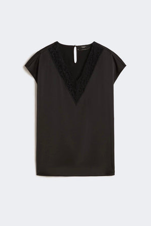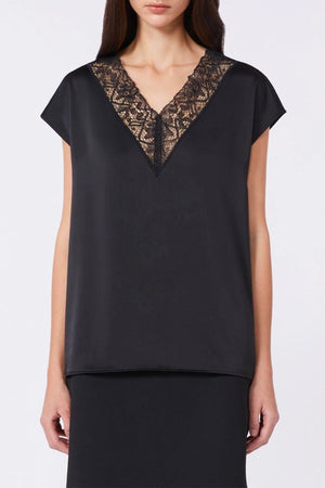 Un top smanicato che incarna l'eleganza sofisticata con dettagli ricercati. Realizzato in raso lavato, offre una fluidità naturale e una lucentezza discreta che caratterizza i capi di lusso autentico. Lo scollo a V impreziosito da un profilo in pizzo passamaneria aggiunge un tocco di femminilità e raffinatezza, mentre le maniche ad aletta creano una silhouette leggera e contemporanea. La linea fluida si adatta perfettamente al corpo, garantendo comfort e eleganza in ogni movimento. La chiusura a goccia con bottoncino sul retro assicura praticità e dettagli sartoriali curati, mentre gli spacchi laterali aggiungono movimento e versatilità nel styling. Un capo versatile perfetto per occasioni speciali o per elevare il guardaroba quotidiano con discreta sofisticazione.