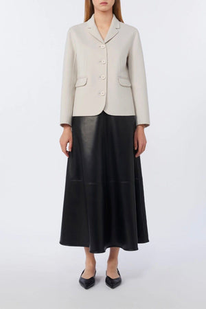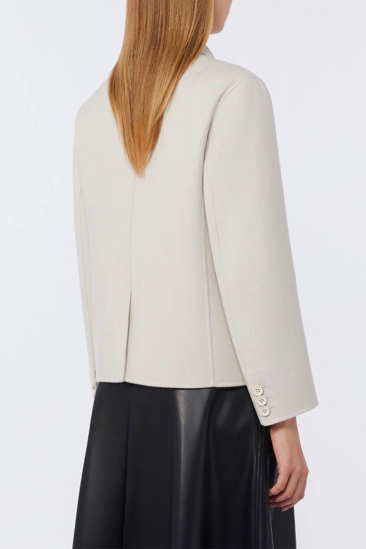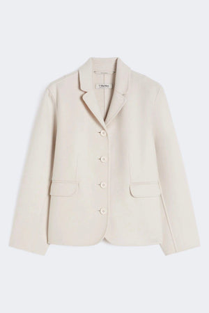 Blazer monopetto in doppio drap di pura lana, caratterizzato da una silhouette essenziale e raffinata. Realizzato con cucito a mano, presenta un collo a rever contenuto e maniche a giro rifinite con bottoni. La chiusura frontale a bottoni a vista enfatizza il design minimalista, mentre le tasche a filetto con patta applicata e lo spacco centrale sul retro garantiscono praticità e movimento. Un capo versatile che combina artigianalità e eleganza senza tempo.