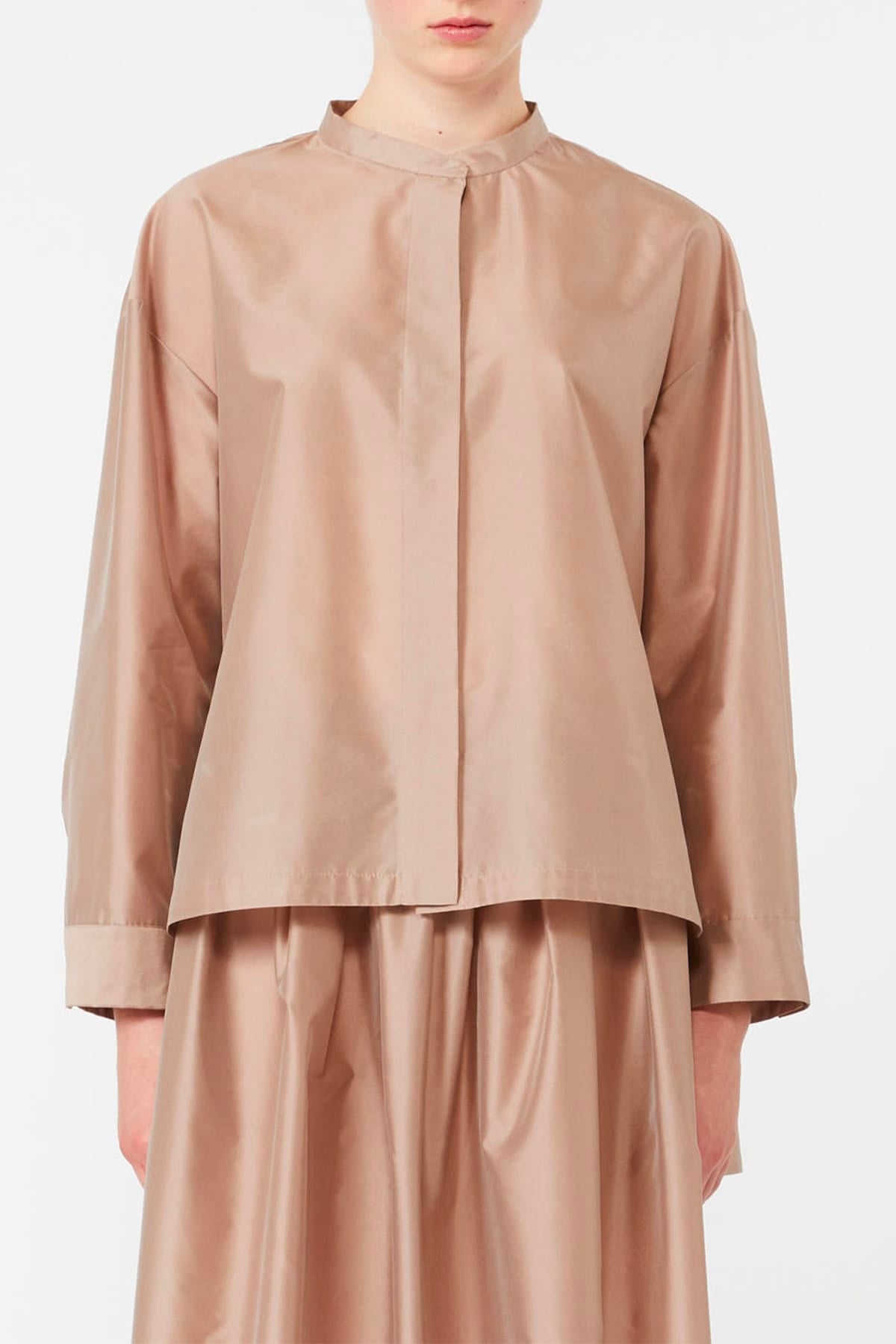 Camicia oversize in organza di seta mista dal design sofisticato e contemporaneo. Caratterizzata da un fondo asimmetrico più lungo sul retro, crea una silhouette elegante e dinamica. Dettagli costruttivi: colletto alla coreana, maniche lunghe a giro basso con polsino a camicia, chiusura nascosta all'inglese con bottoni in madreperla. Gli spacchi laterali stondati garantiscono libertà di movimento, mentre il taglio sprone e la piega centrale sul retro definiscono una vestibilità raffinata. Un capo versatile perfetto per occasioni formali e casual, che combina comfort e stile senza compromessi.