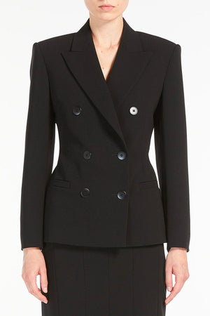Blazer femminile doppiopetto in cady, con una silhouette a clessidra che accentua la figura grazie alle pinces cucite in vita sulla schiena. Il modello è foderato, caratterizzato da un elegante collo rever a lancia e maniche lunghe a giro, che conferiscono un tocco sofisticato. Le tasche a filetto orizzontale sul davanti aggiungono un dettaglio funzionale e raffinato. La chiusura frontale con 6 bottoni completa il design, rendendo questo blazer un capo perfetto per un look formale e femminile, ideale per l'ufficio o eventi eleganti.