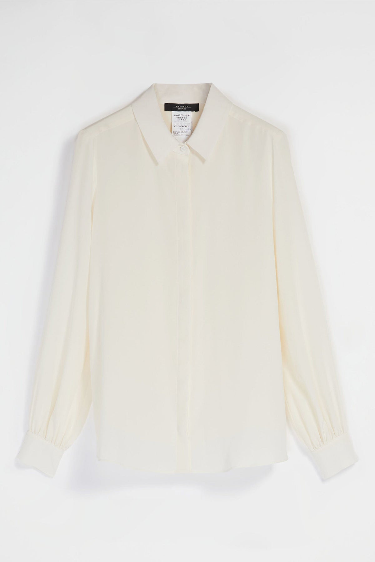 Camicia realizzata in crêpe de Chine di seta lavata. Il modello ha colletto classico, sprone sul retro e maniche lunghe con leggero arriccio sui polsi. Chiusura coperta con bottoni